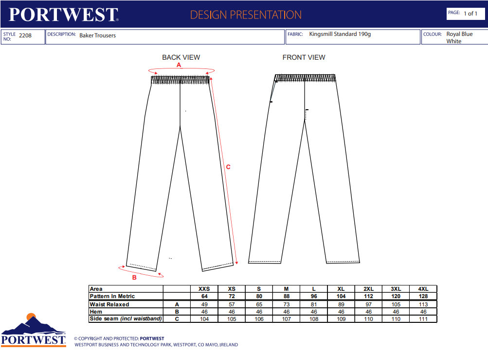 Ľahké a pohodlné pekárske nohavice z kolekcie Potravinársky priemysel sú navrhnuté s ohľadom na najvyššie štandardy hygieny a komfortu. Vyrobené z kvalitnej tkaniny Kingsmill Polycotton (65% polyester, 35% bavlna, 190g), ktorá sa vyznačuje vynikajúcou stálosťou farieb a minimálnou zrážavosťou. Navyše, certifikát OEKO-TEX® zaručuje, že materiál neobsahuje škodlivé látky a je bezpečný pre pokožku. Nohavice disponujú plne elastickým pásom so sťahovacou šnúrkou, ktorý zabezpečuje spoľahlivé a pohodlné uchytenie počas celodennej práce. Ich praktický bezvreckový dizajn, bez vonkajších aj vnútorných vreciek, minimalizuje riziko zachytenia nečistôt a baktérií, čo je kľúčové v potravinárskom prostredí. Vďaka štandardnému strihu poskytujú nohavice voľnosť pohybu a pohodlie pri rôznych pracovných činnostiach. Sú vhodné na priemyselné pranie a možno ich prať v práčke pri teplote do 60°C.