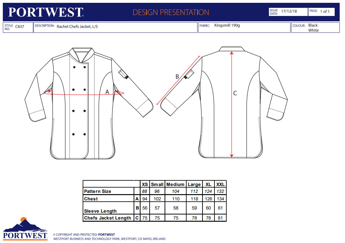 Portwest C837 Rachel Dámsky kuchársky rondon s dlhým rukávom