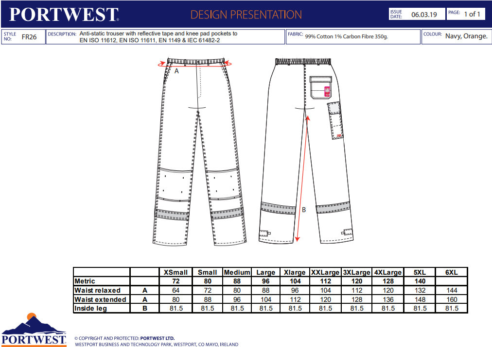 Nohavice sú skonštruované s reflexnou páskou s vysokou viditeľnosťou, ktorá je dvakrát prešitá na zvýšenie odolnosti. Medzi vlastnosti patria trojito prešité švy, pásy s vysokou viditeľnosťou na nohaviciach, vrecká na kolenách, vrecko na pravítko, predný mosadzný zips a nastaviteľný spodný otvor nohavíc. Materiál: Vonkajšia látka: 99% Bavlna, 1% Uhlíkové vlákno- - Radiačné; konvenčné a kontaktné teplo