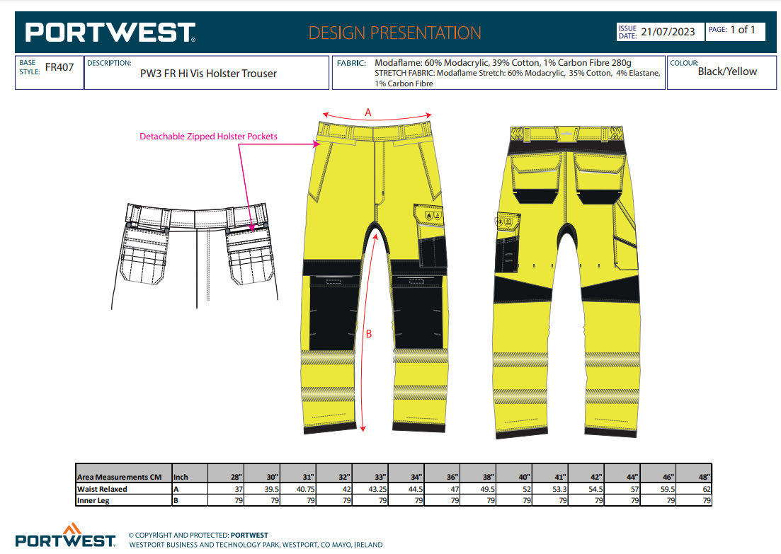 Inovatívne strečové nohavice Hi-Vis FR využívajúce vysoko výkonnú obojsmernú strečovú tkaninu, ktorá poskytuje maximálny rozsah pohybu pri práci. Medzi inteligentné funkcie patria multifunkčné puzdrové vrecká, vrecká na kolená s horným plnením a ľahko prístupné viacsmerné vrecko na stehne pre bezpečné uloženie telefónu, kľúčov a nástrojov. Vystužená tkanina FR na kľúčových miestach oderu pre maximálnu odolnosť. Materiál: Vonkajšia látka: 60% Modakryl, 39% Bavlna, 1% karbónové vlákno; Kontrastná látka: 60% modakryl, 35% bavlna, 4% elastan, 1% uhlíkové vlákno