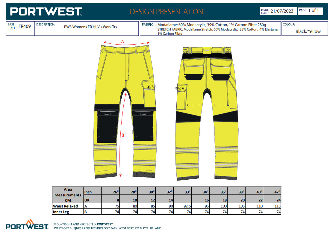 Inovatívne strečové PW3 FR Hi-Vis Dámske nohavice s vysokou viditeľnosťou, ktoré využívajú vysoko výkonnú obojsmernú strečovú látku, ktorá poskytuje maximálny rozsah pohybu pri práci. Medzi inteligentné funkcie patria vrecká na kolená s horným plnením a ľahko prístupné viacsmerné vrecko na stehne pre bezpečné uloženie telefónu, kľúčov a nástrojov. Vystužená tkanina FR na kľúčových miestach oderu pre maximálnu odolnosť. Dodatočné prispôsobenie okolo pása a bokov zaisťuje maximálne pohodlie po dlhšiu dobu Navrhnuté v súlade s priemernou výškou a dĺžkou ramien žien znižuje riziko zakopnutia a zachytenia., Materiál: Vonkajšia látka: 60% Modakryl, 39% Bavlna, 1% karbónové vlákno; Kontrastná látka: 60% modakryl, 35% bavlna, 4% elastan, 1% uhlíkové vlákno