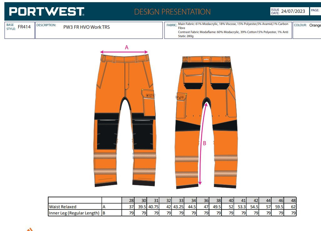 Moderné a vysoko viditeľné pracovné nohavice FR414 PW3 sú vyrobené z inherentne nehorľavého materiálu Modaflame Work HVO, ktorý zaručuje trvalú ochranu proti plameňom. Ponúkajú maximálne pohodlie vďaka bočnému elastickému pásu a nastaviteľnému lemu pre prispôsobenie dĺžky nôh. FR odolná výstužná tkanina na kľúčových miestach oderu a trojité prešívanie zaisťujú vynikajúcu odolnosť. Praktické funkcie zahŕňajú 8 vreciek pre skladovanie, ľahko prístupné viacsmerné vrecko na stehne a vrecká na horné nakladanie kolenačiek. Nohavice spĺňajú širokú škálu bezpečnostných noriem: EN ISO 11612 (A1+A2, B1, C1, F1) pre ochranu proti teplu a plameňu, EN ISO 11611 Trieda 1 (A1+A2) pre ochranu pri zváraní, EN 1149-5 (antistatické), IEC 61482-2 (ELIM 7 CAL/CM2, ATPV 8 CAL/CM2, APC 1) pre ochranu proti elektrickému oblúku, EN 13034 Typ PB (6) (obmedzená ochrana proti chemikáliám) a EN ISO 20471 Trieda 2 (vysoká viditeľnosť). Oranžová verzia spĺňa aj normu RIS 3279-TOM Číslo 2 pre železničný priemysel. Navyše poskytujú ochranu proti UV žiareniu s faktorom 40 UPF. Sú nemagnetické (bez niklu a železa) a CE certifikované. Tieto odolné, pohodlné a vysoko funkčné pracovné nohavice FR414 PW3 sú ideálnou voľbou pre profesionálov pracujúcich v náročných prostrediach s rôznymi rizikami.