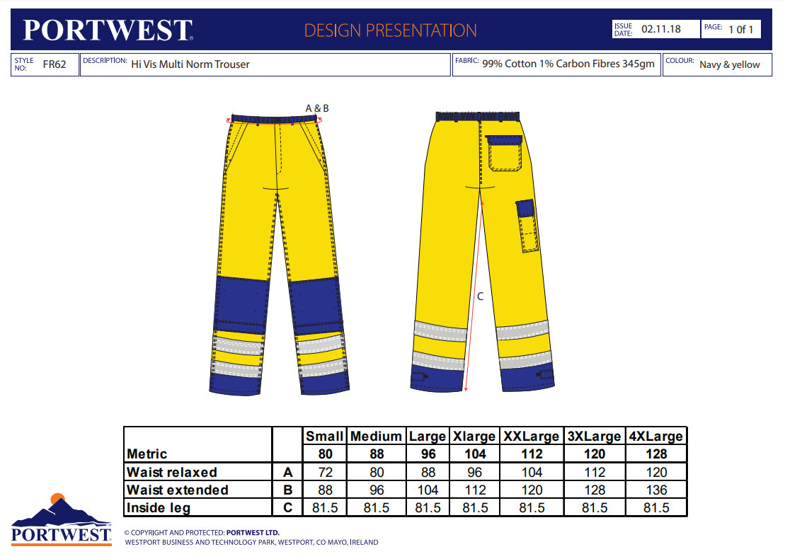 FR62 je vyrobený z vysoko inovatívnej tkaniny Bizflame Multi. Tento pohodlný odev poskytuje ochranu pred viacerými rizikami vrátane vystavenia teplu, ohňu, chemikáliám, elektrickému oblúku a zváraniu. Medzi vlastnosti patria dvojité prešívané Hi-Vis pásy na nohaviciach, predný mosadzný zips a dve predné vrecká s chlopňou, jedno zadné vrecko s chlopňou a spodné vrecko na náradie s chlopňou. Materiál: Vonkajšia látka: 99% Bavlna, 1% Uhlíkové vlákno- - Radiačné; konvenčné a kontaktné teplo