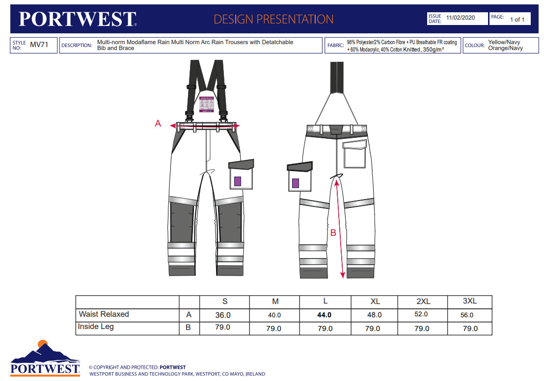 Modaflame Rain Multi Norm Arc nohavice poskytujú úplnú ochranu pred radom štandardov a sú nabité funkciami. Vďaka funkcii zapínania na zips vzadu sa dá traková časť úplne odstrániť, aby sa zmenila na nohavice, čo zvyšuje jej celkovú všestrannosť. Reflexná páska FR zlepšuje viditeľnosť, zatiaľ čo kontrastné kolenné panely a lem chránia pred nečistotami. Materiál: Vonkajšia látka: 98% polyester, 2% uhlíkové vlákno, PU povlak, lepené na 60% modakryl, 40% bavlna; Podšívková látka: 100% Bavlna s ohňovzdornou podšívkou- - Radiačné; konvenčné a kontaktné teplo